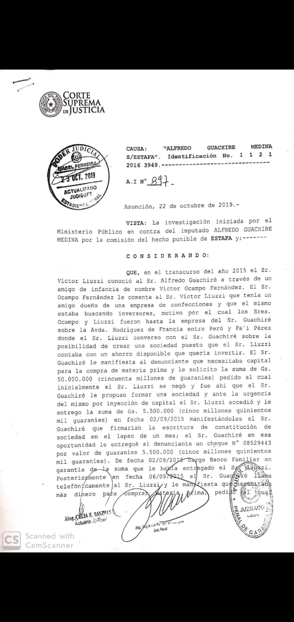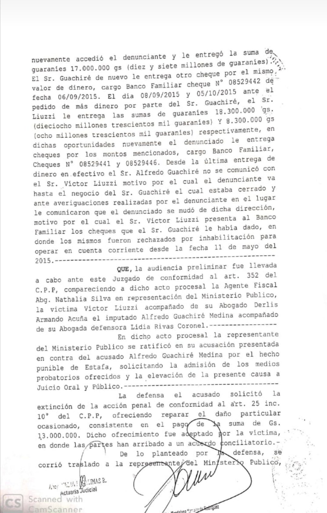 Según el expediente, en el año 2015, el ciudadano Víctor Liuzzi conoció a Alfredo Guachiré a través de un amigo de infancia. Este le comentó que tenía un amigo dueño de una empresa de confecciones y que el mismo estaba “buscando inversores”. Juntos fueron a conversar con el Guachiré, quien “manifiesta al denunciante que necesitaba capital para la compra de materia prima y le solicitó la suma de ₲ 50 millones”.