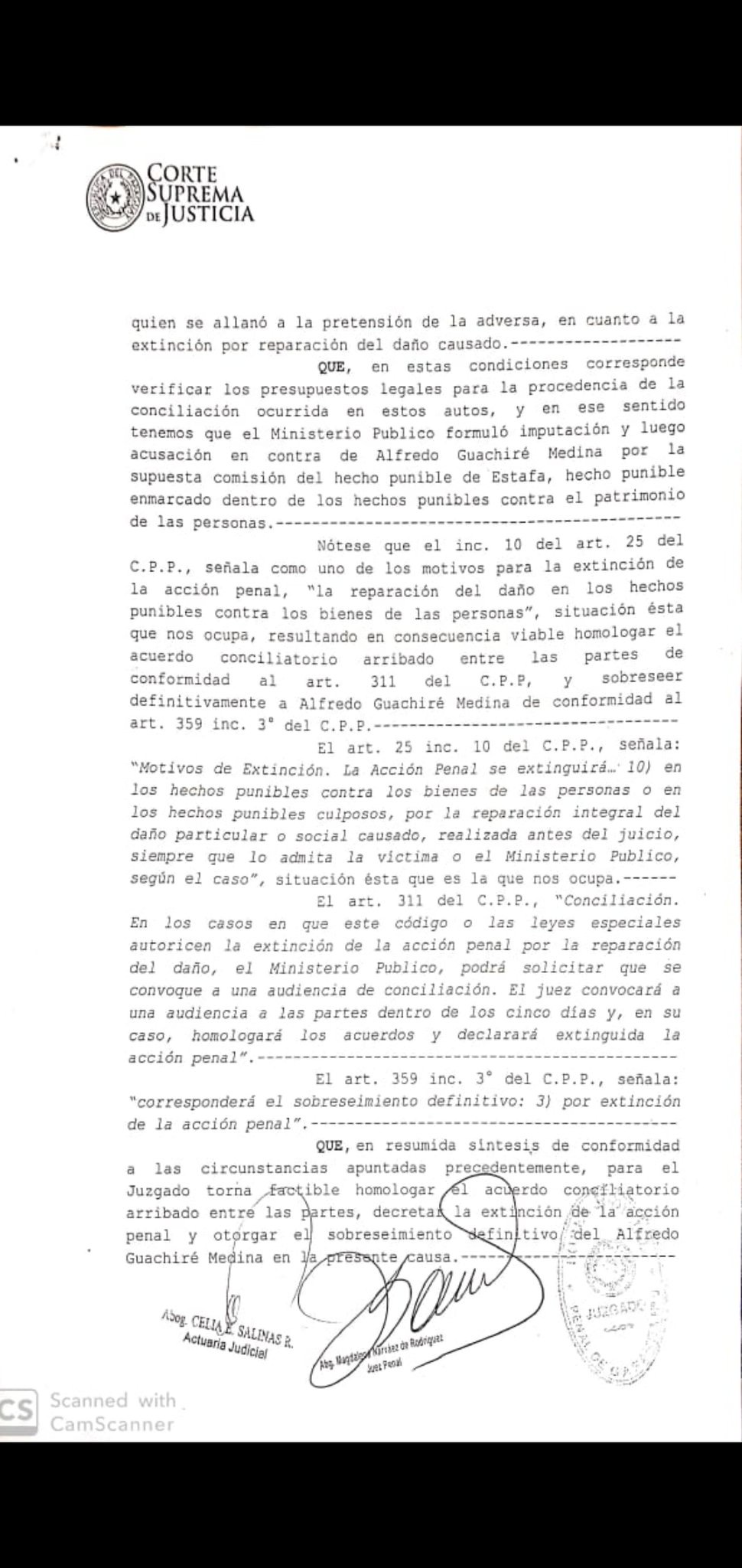 A raíz de esto, en el transcurso de una audiencia preliminar sobre la causa, el Ministerio Público “se reatificó en la acusación presentada en contra del acusado Alfredo Guachiré Medina por el hecho punible de Estafa. Ante esta perspectiva, el ex jefe de contrataciones de la SEN ofreció una “reparación del daño ocasionado, consistente en el pago de la suma de ₲ 13.000.000”.