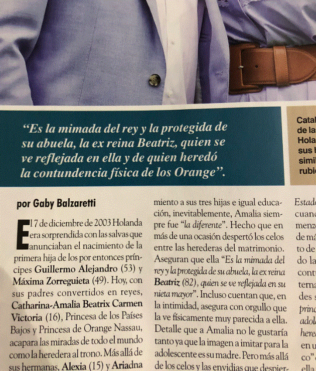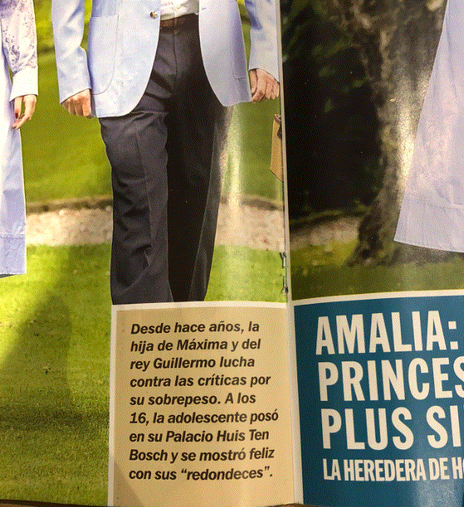 «La hija mayor de Máxima luce con orgullo su look ‘plus size’ [talle extra grande]»; «heredó la contundencia física de los Orange«; «Se mostró feliz con sus ‘redondeces‘». Estas son algunas de las frases con las que la revista Caras (Editorial Perfil, Argentina) se refiere a la joven princesa Amalia de 16 años, heredera al trono de los Países Bajos.