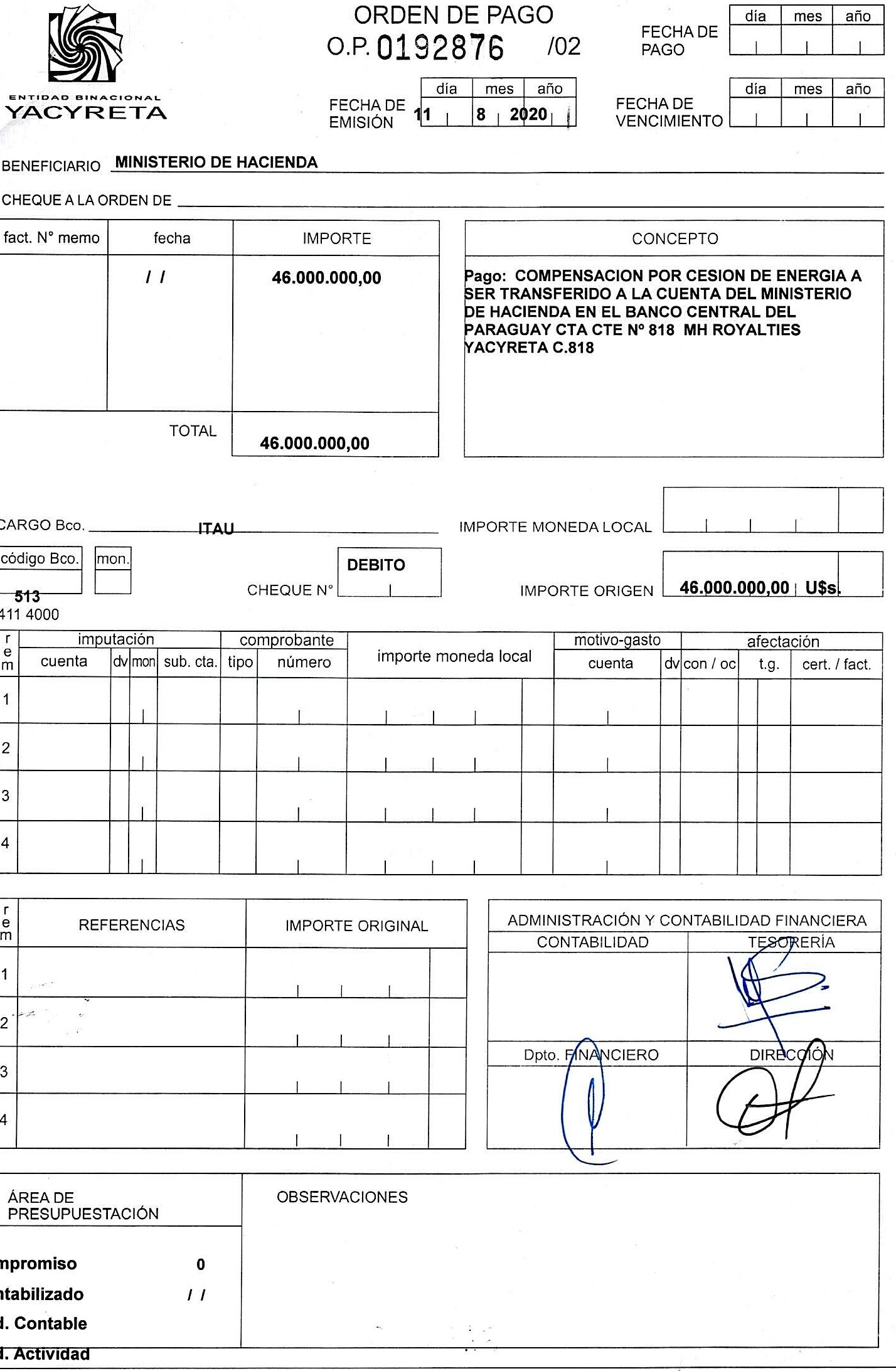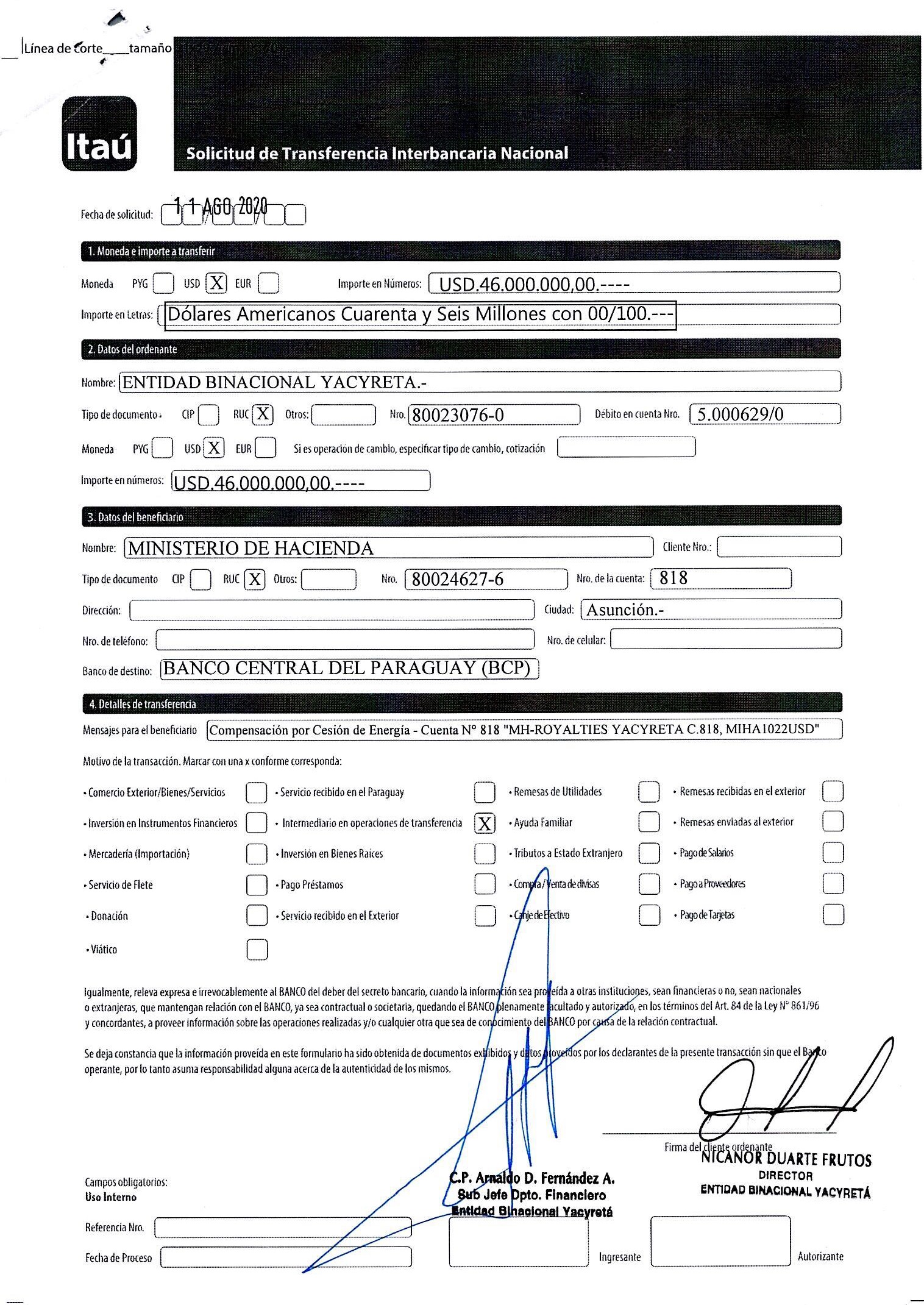 Lo cierto es que este martes 11 de agosto se conoció que la EBY sí transfirió a Hacienda Nacional el monto de USD 46 millones en concepto de compensación de energía (royalties de Yacyretá). Se trata de un millón de dólares más de lo que estaba calendarizado.