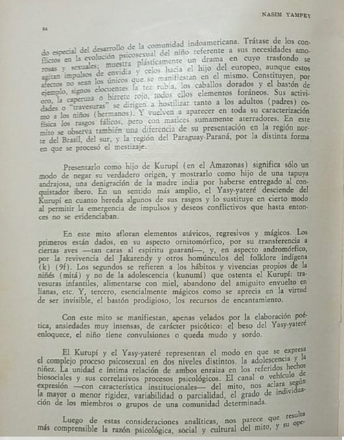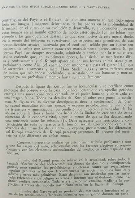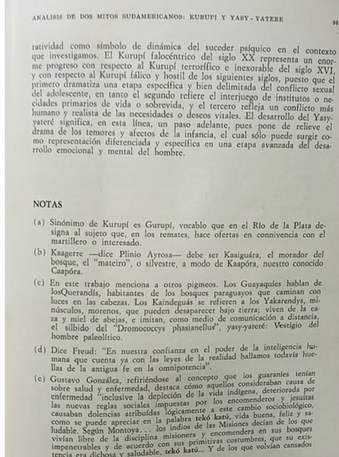 Ha habido buenas exégesis desde el punto de vista freudiano del fenómeno de los cuentos y mitos, recuerdo haber hojeado al menos dos: El lenguaje olvidado: Introducción a la comprensión de sueños, cuentos y mitos de Erich Fromm y Psicoanálisis de los cuentos de hadas de Bruno Bettelheim. En esa línea de hermenéutica psicoanalítica, uno de los pioneros en Paraguay es Nasim Yampey con su trabajo: Análisis de dos Mitos Sudamericanos: Kurupí y Yasy-yateré. Volumen 4 – No. 1, Junio de 1969, Suplemento Antropológico de la Revista del Ateneo Paraguayo.