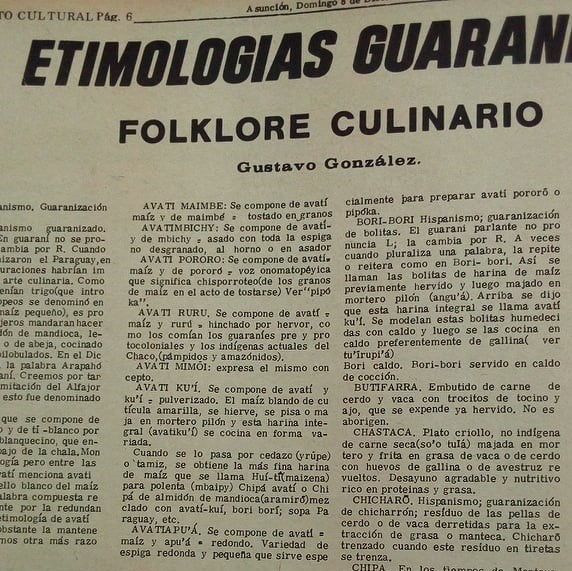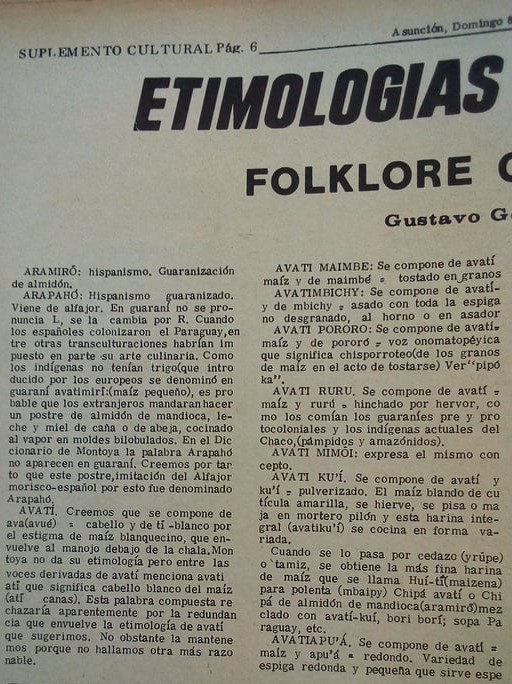 Avatimbichy, se compone de avatí, maíz- y de mbichy- asado con toda la espiga no desgranado, al horno o en asador (Etimologías Guaraní. Folklore Culinario, Gustavo González, suplemento dominical de La Tribuna, 1969)