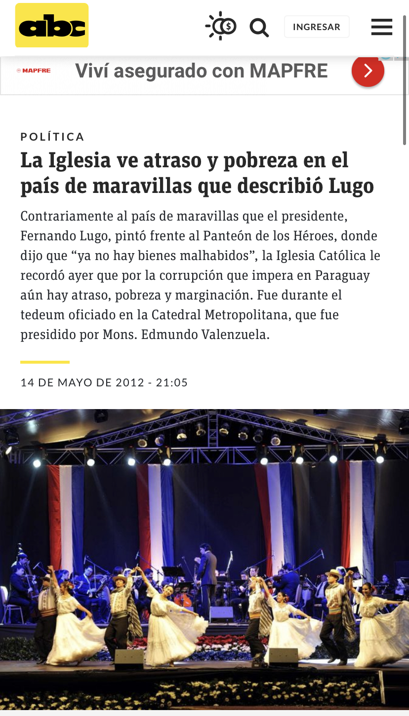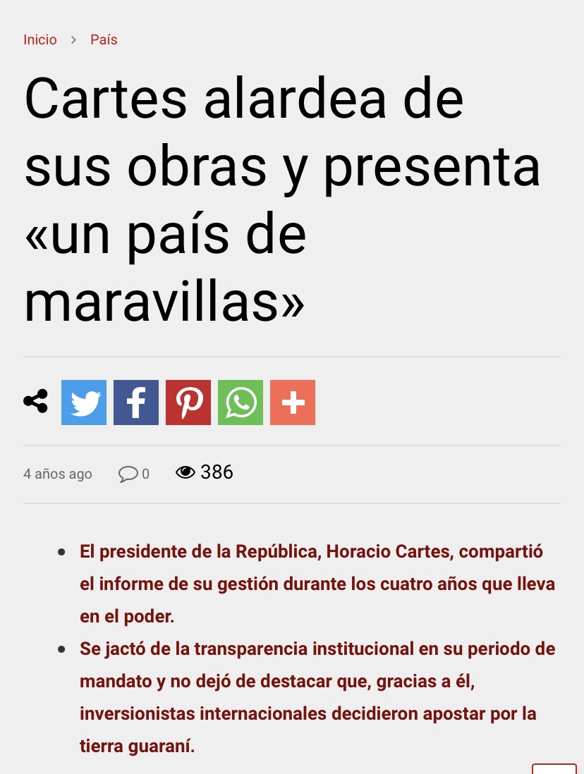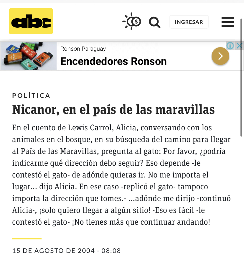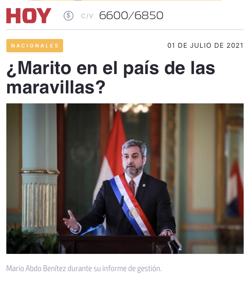 Antes de Marito, ya Nicanor, Lugo y Cartes recibieron la misma crítica, luego de pronunciar sus respectivos informes de gestión. De ese modo, el eslogan de “país de maravillas” pierde el dramatismo de su uso inicial en nuestro país, y se va convirtiendo en una simple liturgia de ocasión, como cuando se comenta el clima en el ascensor o se advierte a alguien que está lloviendo, es decir una devaluada expresión del folclore cotidiano.