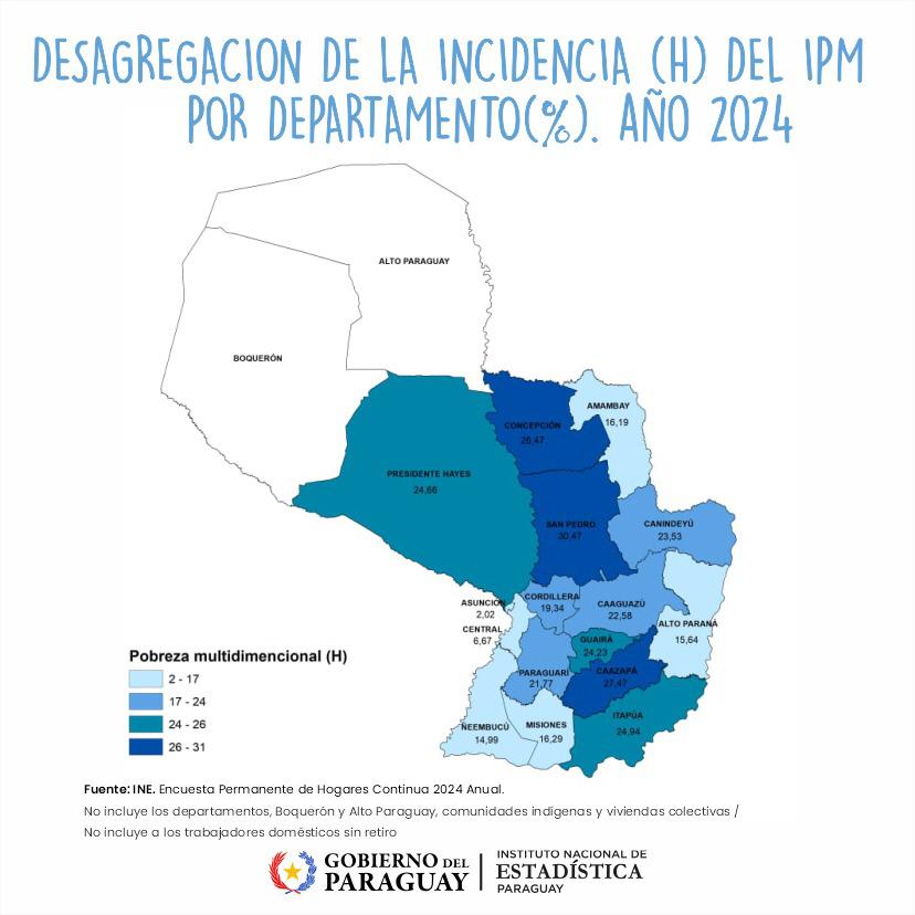 Por departamentos, San Pedro encabeza la lista con el 30,47% de su población en situación de pobreza multidimensional, seguido por Caazapá (27,47%), Concepción (26,47%) e Itapúa (24,94%). En el otro extremo, Asunción registra el porcentaje más bajo, con apenas un 2,02%.