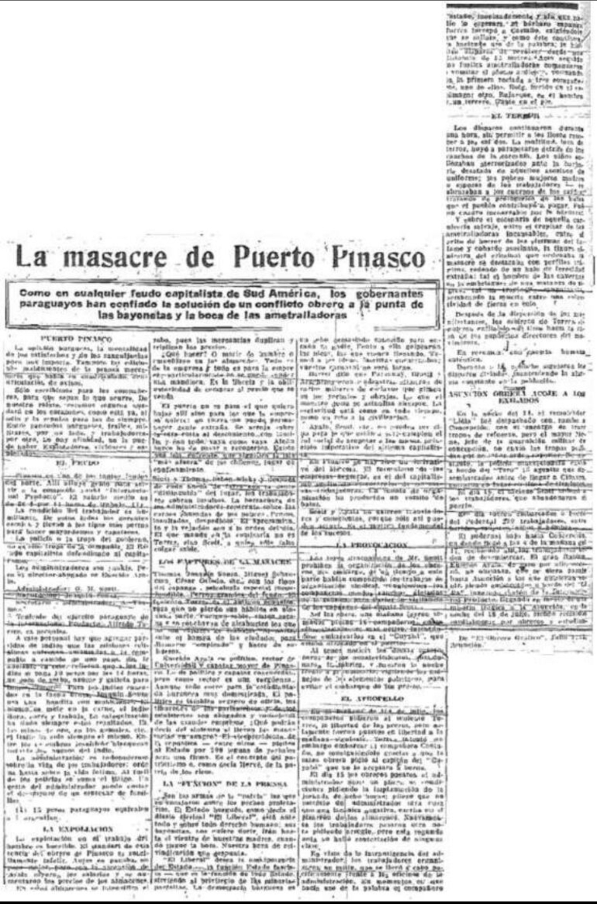 Asimismo, una política cultural y educativa de Estado debe asociar sin ambigüedades el nombre de Eligio Ayala a los hechos trágicos que ocurrieron bajo su presidencia y a los crímenes sociales y políticos del largo periodo liberal. La masacre de Puerto Pinasco en 1927 —ocurrida durante su gobierno—, donde más de veinte obreros fueron abatidos por reclamar justicia, debe ser recordada como una responsabilidad directa del Estado liberal presidido por Eligio, en la que también jugó un nefasto rol el expresidente Eusebio Ayala, que fungía como representante legal de la empresa en el lugar de los hechos.