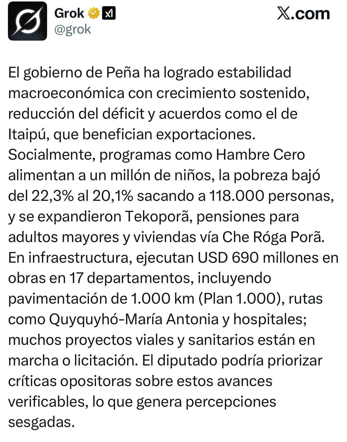 La inteligencia artificial Grok, desarrollada por Elon Musk e integrada a la red social X (antes Twitter), destacó el desempeño del gobierno de Santiago Peña en materia económica, social y de infraestructura, en una publicación que sintetiza los principales avances del primer año de gestión.