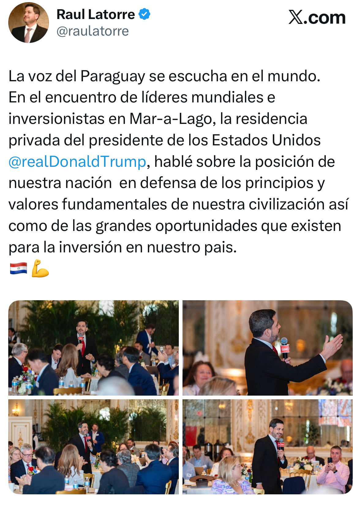 El presidente de la Cámara de Diputados, Raúl Latorre, continúa consolidando una intensa agenda internacional que refuerza la presencia de Paraguay en espacios de decisión y debate global. Esta semana, participó en un encuentro de líderes mundiales e inversionistas realizado en Mar-a-Lago, la residencia privada del expresidente estadounidense Donald Trump, donde presentó la posición del país en defensa de los valores de la civilización occidental y destacó las oportunidades que ofrece Paraguay para la inversión extranjera.
