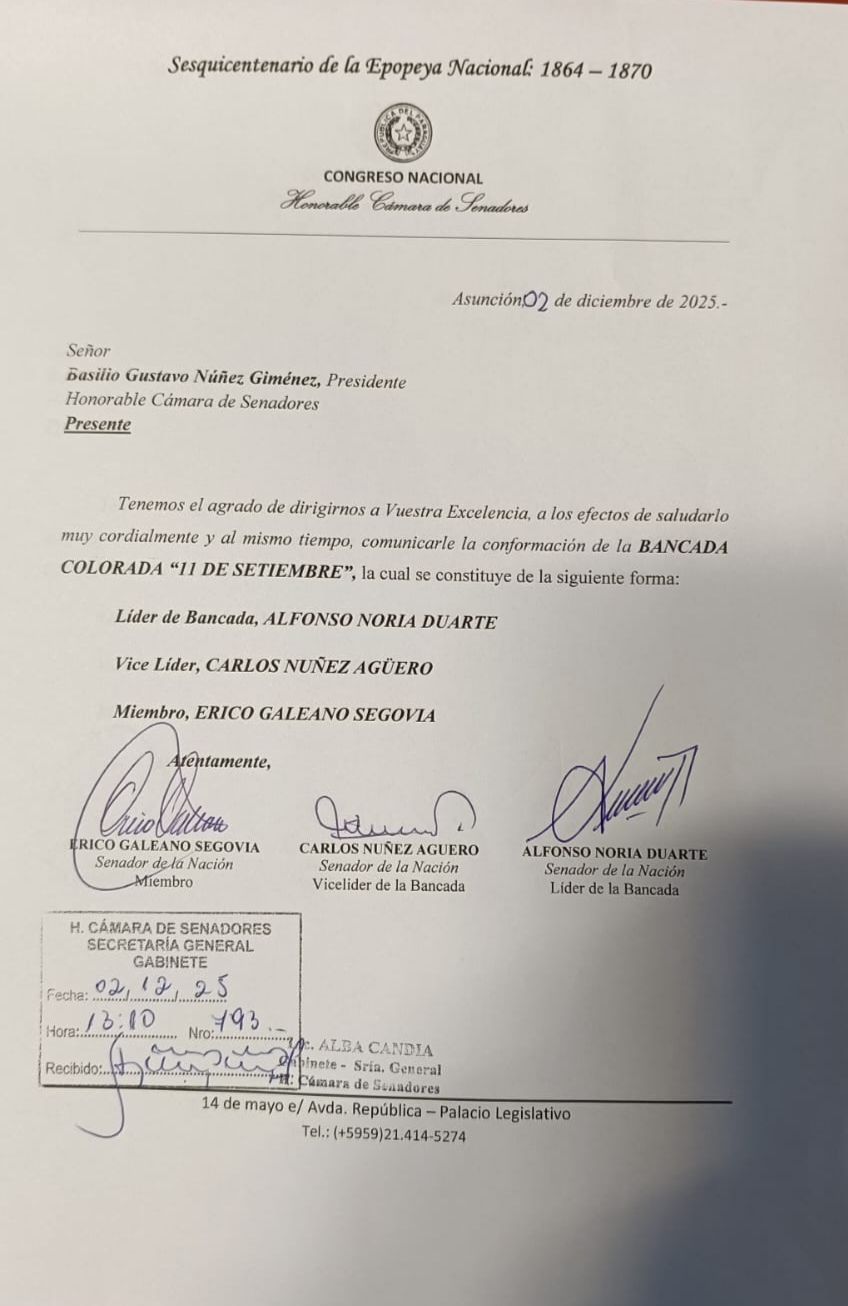 La ruptura dentro de Honor Colorado quedó oficializada este martes, luego de que los senadores Alfonso Noria, Carlos Núñez y Erico Galeano presentaran ante la Presidencia de la Cámara Alta la conformación de la Bancada Colorada “11 de Setiembre”. El documento remite la nómina interna: Alfonso Noria como líder, Carlos Núñez como vice líder y Erico Galeano como miembro.